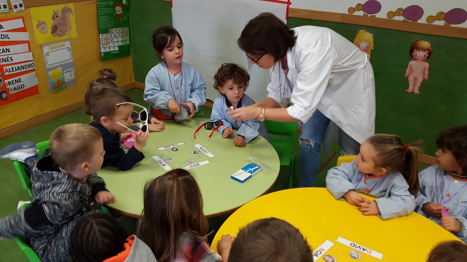 Con la ayuda de su audiómetro comprobamos si escuchábamos bien o mal, nos pesamos, hicimos de prestigiosos cirujanos con la indumentaria adecuada y aprendimos que hay que trabajar con guantes para protegerse de infecciones.
